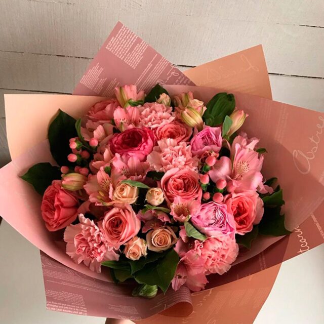 На фото представлен возможный вариант сборки. Мы соберем букет максимально похожий с использованием сезонных цветов и сохранением стиля композиции. Букет получится уникальным и неповторимым, как и его получатель.